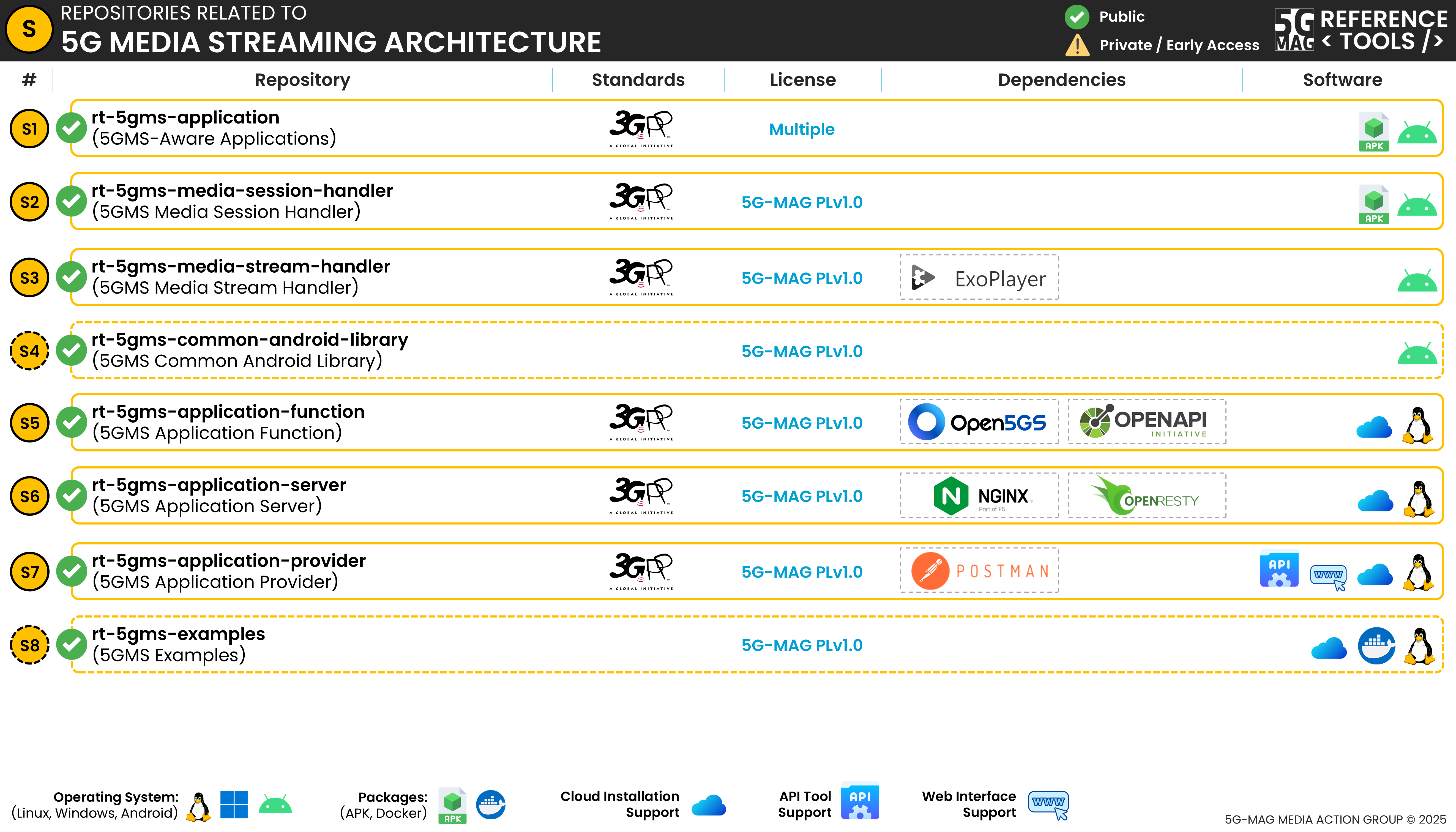 - 5GMSd-Aware Application: An Android application that serves as a reference implementation for 5GMS downlink media streaming. It uses the Media Stream Handler for playback and communication with the Media Session Handler.