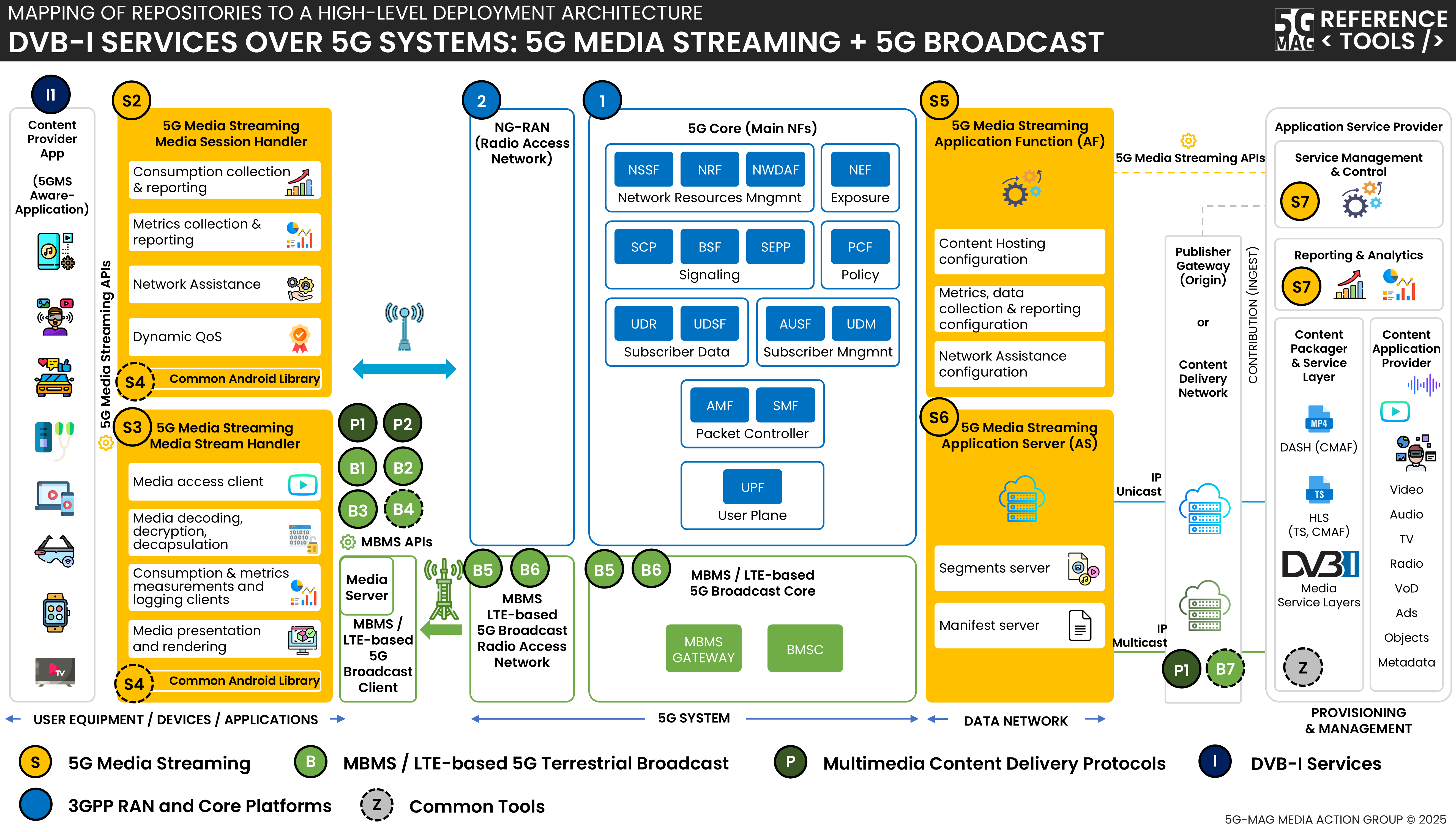 5G Media Streaming: Repositories DVB-I Services: Repositories 5G Broadcast: Repositories Multimedia content delivery protocols: Repositories 3GPP RAN and Core Platforms: Repositories Common Tools: Repositories