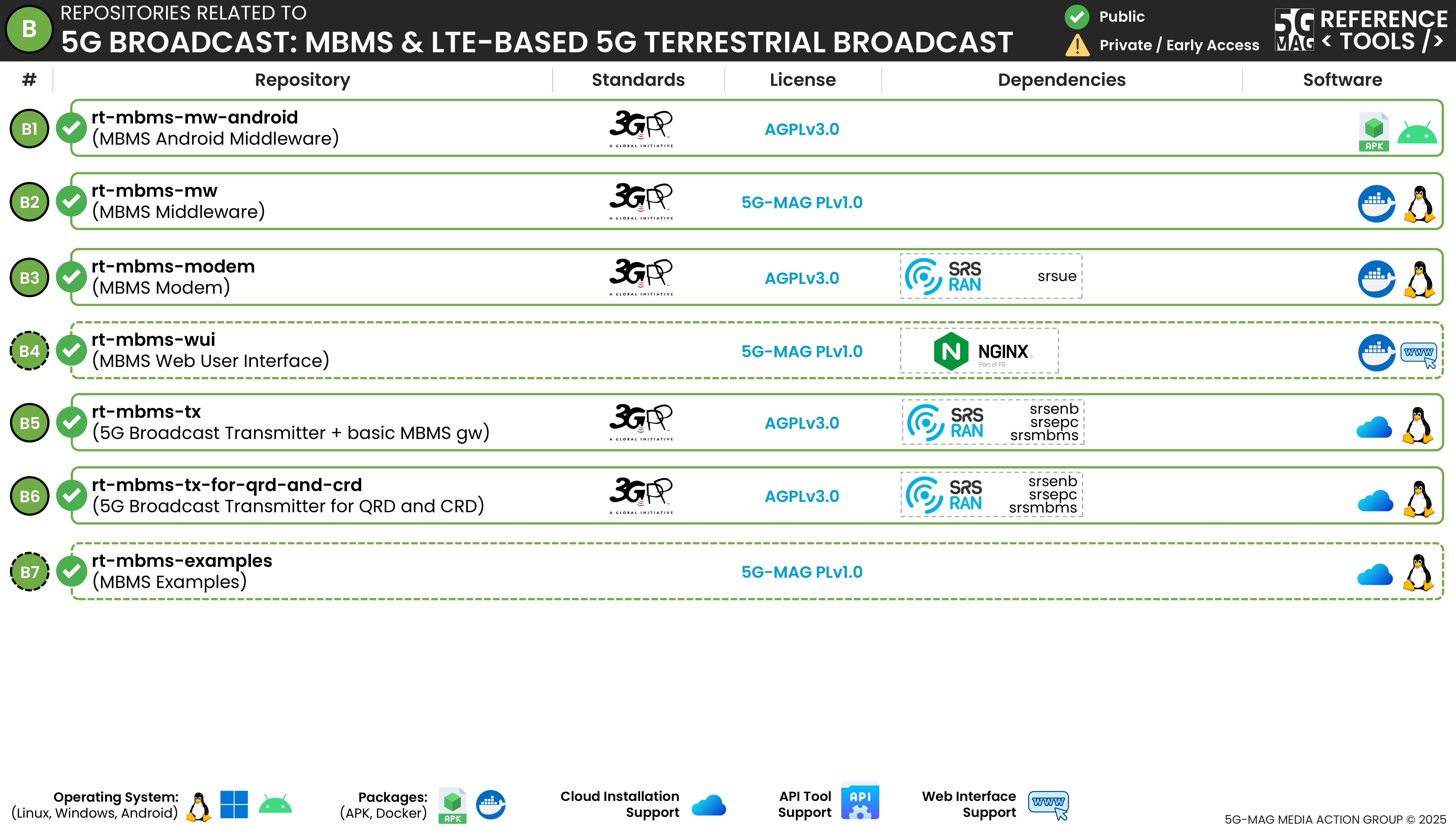 The 5G-MAG Reference Tools Webinterface (rt-wui) provides an optional graphical webinterface with a control display for each 5G-MAG Reference Tools process (MBMS Modem, MBMS Middleware). Its main purpose is to collect and display useful information from the MBMS Modem and the MBMS Middleware. The webinterface provides basic browser-based HLS playback of the HLS manifest and segments provided by the MBMS Middleare using hls.js.