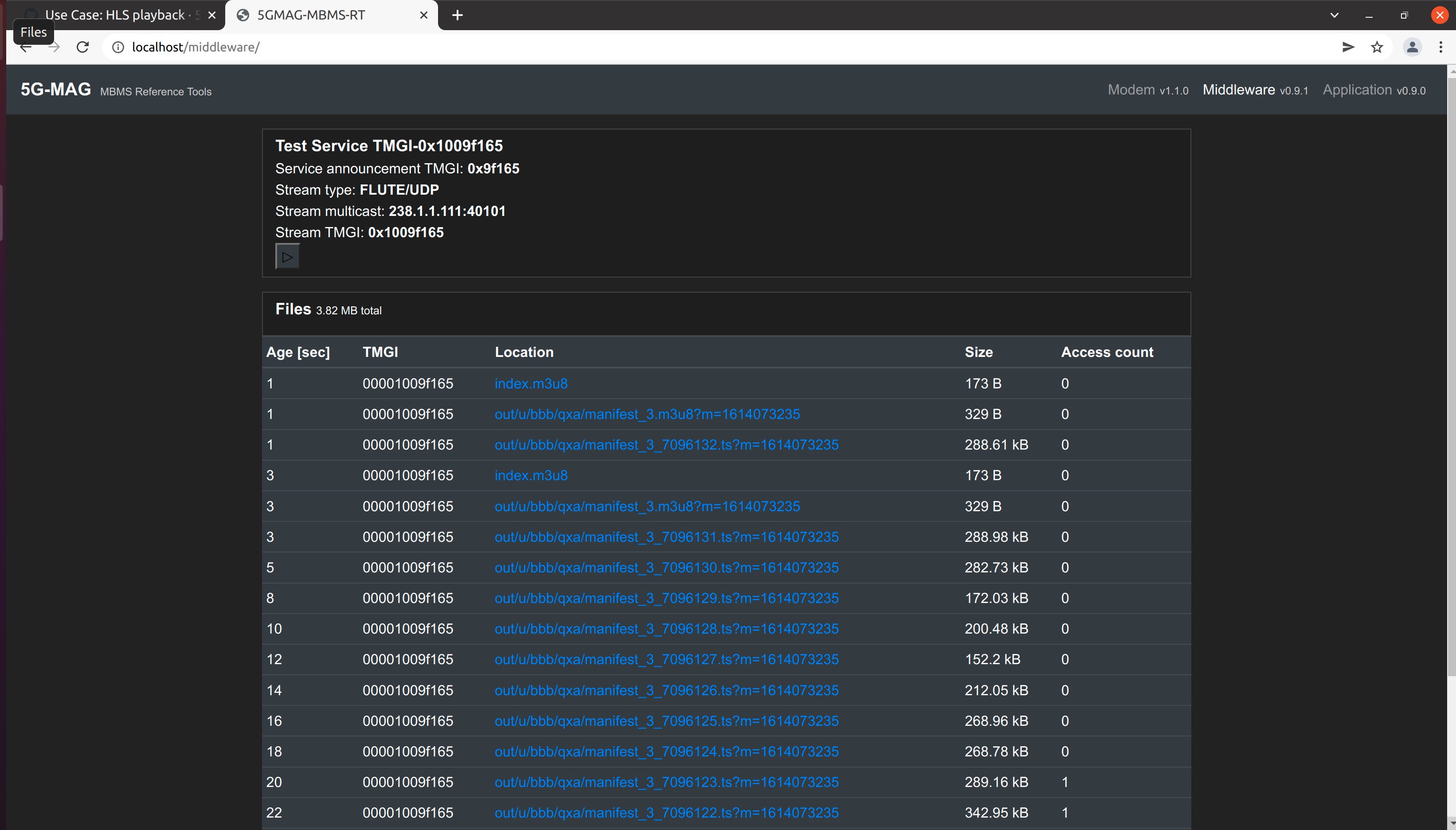 The output of the SDR or the sample file serves as the input for the MBMS Modem. The MBMS Modem exposes the FLUTE encoded content via UDP multicast to the MBMS Middleware. The MBMS Middleware listens to the local tun interface. Received multicast packets from the Receive Process are FLUTE decoded using the 5G-MAG Reference Tools FLUTE library. Once the manifest files and media segments are FLUTE-decoded they are cached in the middleware and made available to the media player via an Nginx proxy. The media player itself is not aware that the content is provided via broadcast.