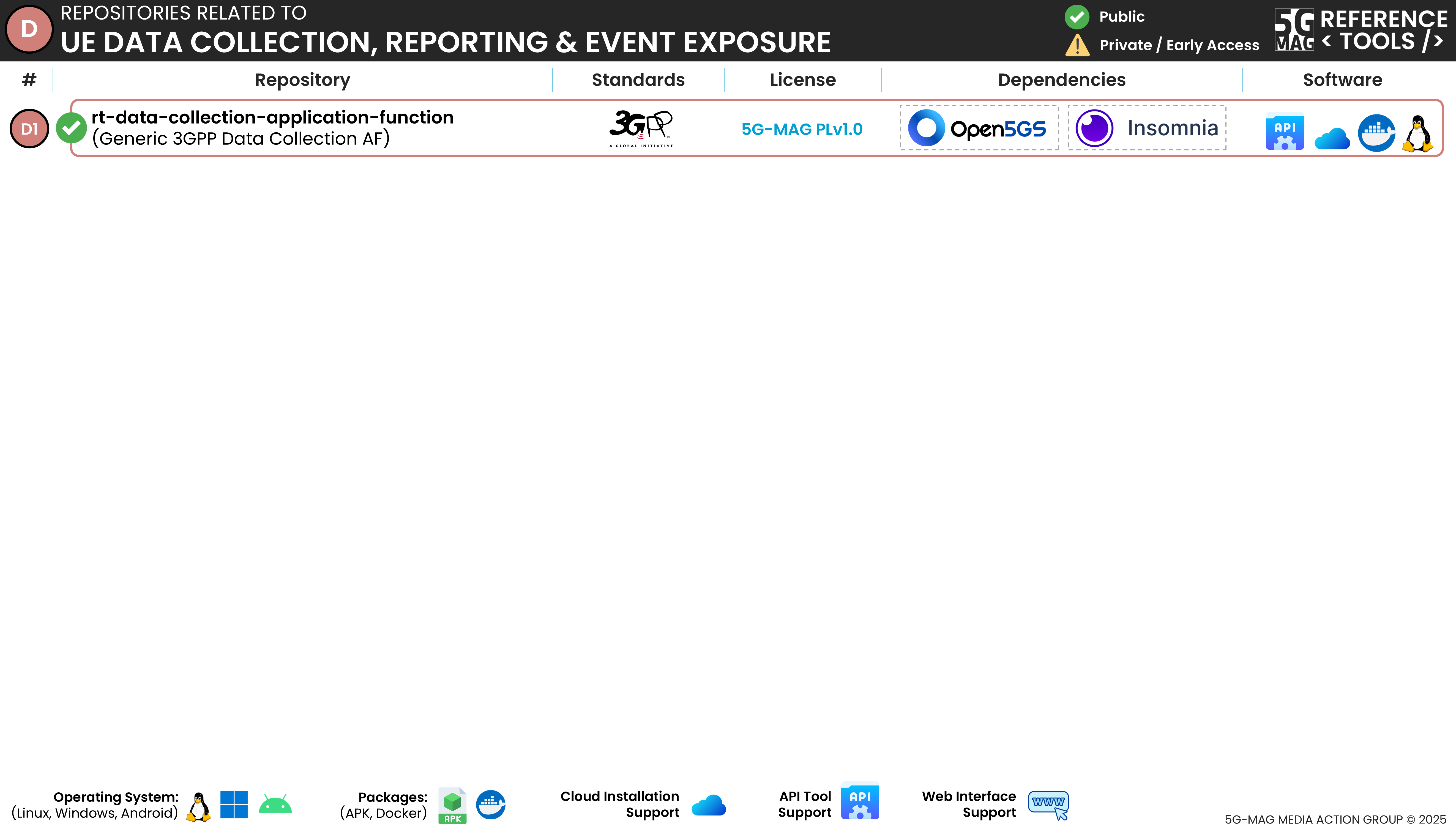 This repository provides a 5G Data Collection Service Provider library and Application Function. The library is designed to be used by this stand alone Application Function or to be used as an embedded service within other Application Functions such as the 5GMS Application Function. The library can provide the interfaces designated as R1-R6 in the 3GPP TS 26.531 specification (See Clause 4.2). The default Application Function implementation here implements some of the data reports and events defined in 3GPP TS 26.531, 3GPP TS 26.532 and 3GPP TS 29.517.