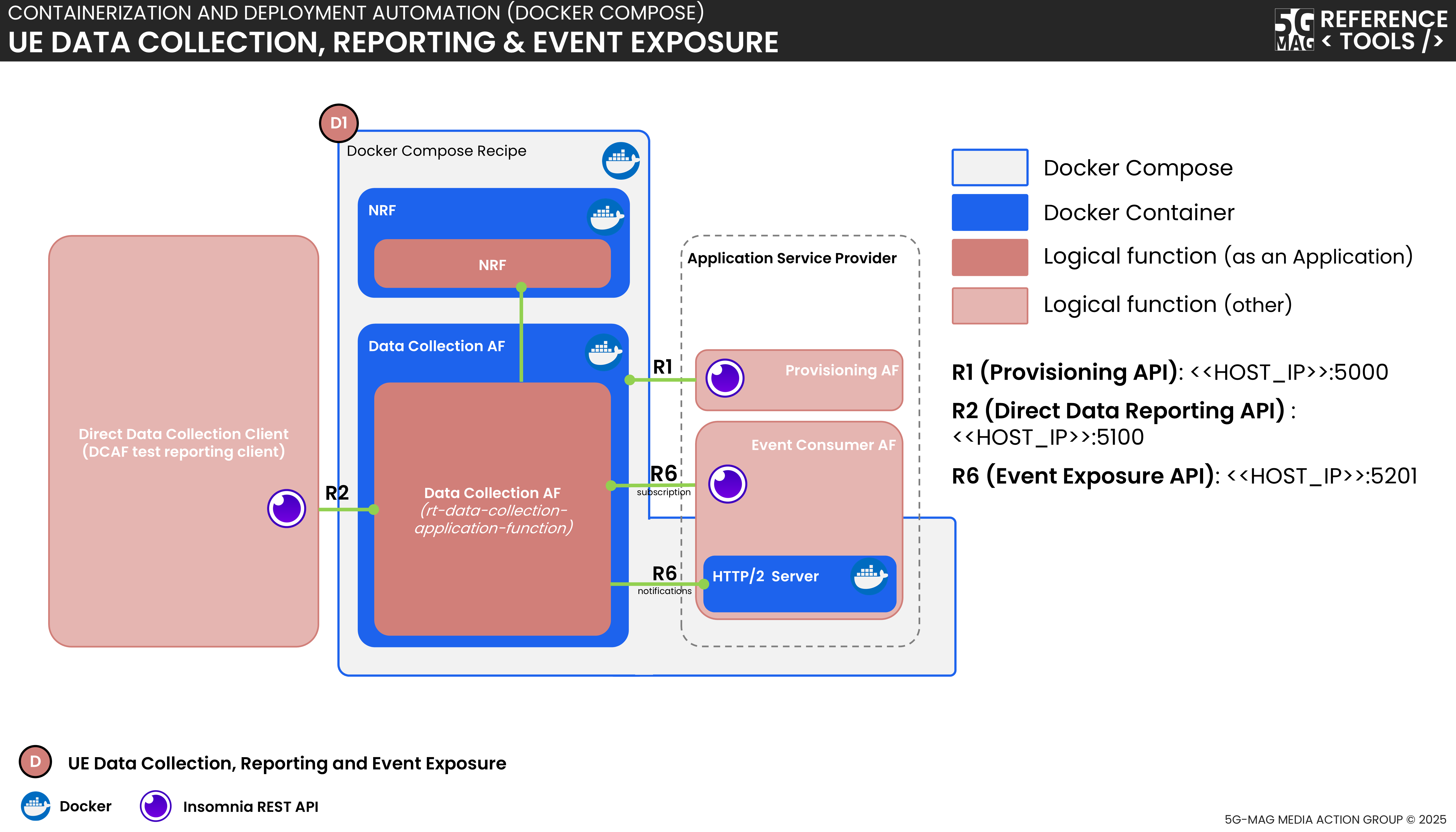nrf: A 5G Core NRF Network Function for the Application Function to register with.dcaf: The Data Collection Application Function that exposes multiple REST APIs to interact with. We will use these APIs later with the Insomnia REST client.h2-server: A fully-functional HTTP/2 server to handle data that is provided by the DCAF as a response to event. subscriptions.